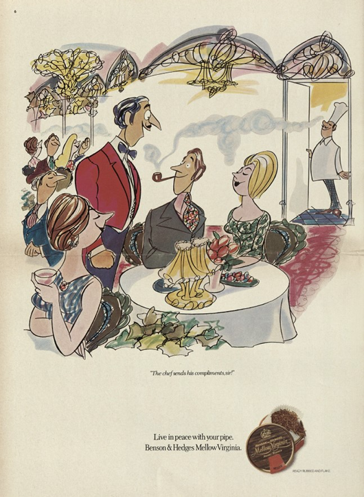 紳士が嗜むパイプの煙の素晴らしい香りが、周りのお客さんばかりか奥の料理人まで魅了している場面です。