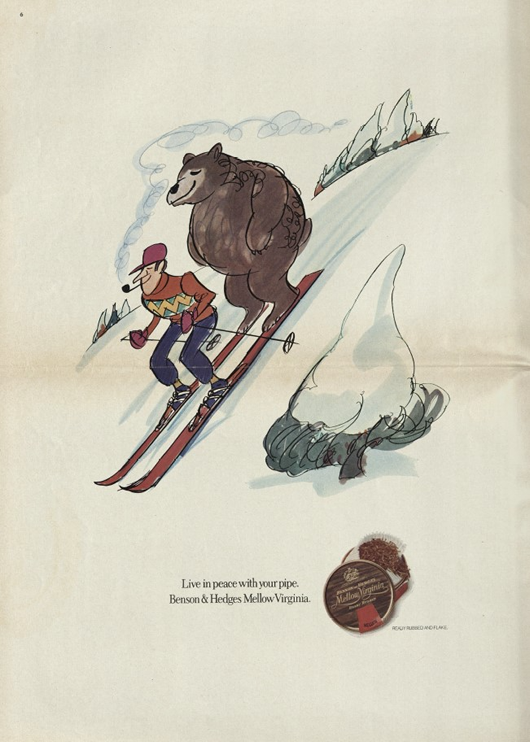 今ではスキーをしながらパイプを喫煙していると周囲の顰蹙を買いそうですが、20世紀の昔はありふれた光景でした。