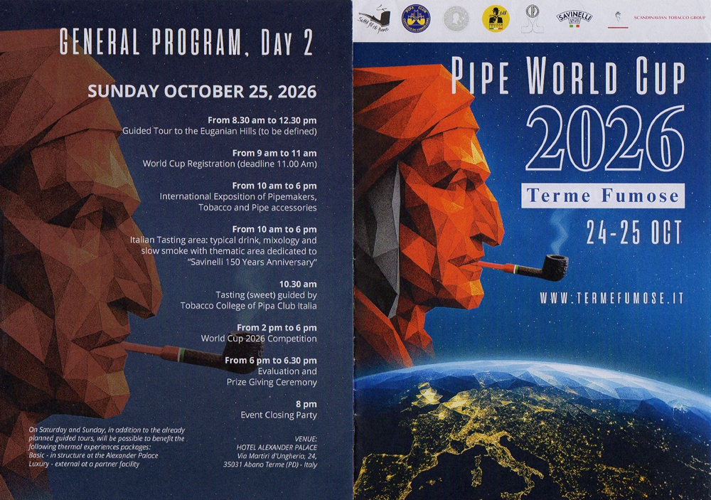 パイプスモーキング・ワールドカップ(WC)が、本年(2026年)10月24日から25日にイタリア・パドヴァ県の有名な高級温泉保養地アーバノ・テルメのホテル・アレクサンダー・パレスにて開催されます。