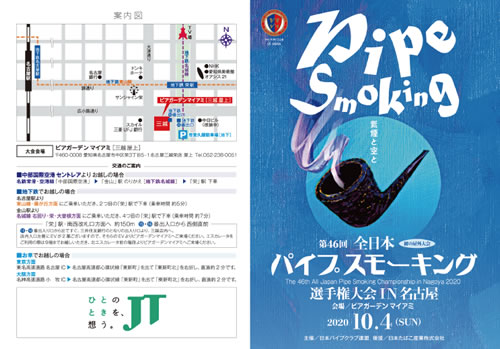 日本パイプクラブ連盟(Pipe Club of Japan:PCJ、会長・森谷周行)は来る10月4日(日)に名古屋市のビアガーデンマイアミ[三越屋上]において、第46回全日本パイプスモーキング選手権大会を開催いたします。 今回は名古屋を中心としたメンバーの“なごやかパイプクラブ゙”が主催し、パイプ愛好家の皆さまを当地で歓迎します。このパイプスモーキング選手権大会に、全国のパイプクラブ会員の方々、あるいはクラブには入会せず独自でパイプを楽しんでおられる愛煙家の皆さま、挙ってご参加ください。ただし参加者が多く密集が予想される場合は、出場をお断りする場合があります。競技者にはパイプ、タンパー、たばこを支給する他、参加記念品をお渡しします。会場の側でパイプショウも開催します。 競技会場は半屋外という新しい試みで、スモーカの対応力が試されます。ルールは従来通り、3グラム(紙巻き約3本分)のパイプたばこを、 支給された競技用パイプに詰め、どれだけ長い間、火を消さないでいられるかを競う競技です。着火は、マッチ2本で1分以内に火をつける、競技中は席を離れない、後は消さないように火と格闘するのみ。最後に残った競技者が「チャンピオン」の称号を獲得します。レディース戦、一組3人の団体競技もあり、過去には女性が個人戦も制し完全制覇となったことも度々あります。 この競技はヨーロッパに始まり、最初は漁師が漁の終了後バーに集まって始めたと言われているが定かではありません。その後クラブライフの一環として盛んになりました。日本では50年ほど前に集まり始めた各地のパイプクラブの定例行事として拡がり、就中日本パイプスモーカーズクラブが創立5周年記念行事として第1回全日本パイプスモーキング選手権大会を開催しました。その後、世界大会を招致するため当日本パイプクラブ連盟が設立され、第3回以降は連盟の主催となり、2018年には再度世界大会を東京・浅草で盛大に挙行したのは記憶に新しいところです。 日本パイプクラブ連盟事務局