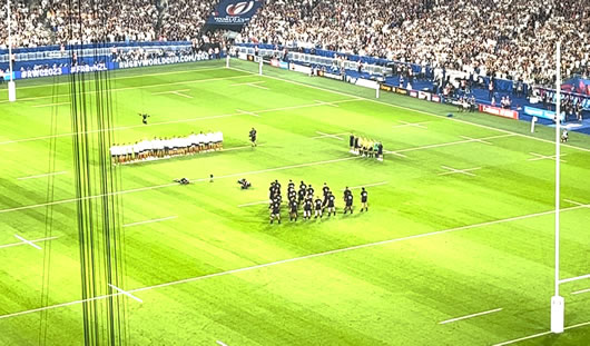 両チームが芝のピッチに姿を現すと、今度は8万の観客が大歓声を上げて歓迎である。ニュージーランドとフランスは因縁のライバルである。南アと並ぶ最多優勝3回を誇るニュージーランドに対し、フランスは1度も優勝していない。しかし準優勝3回は出場国最多、ラグビー界の「シルバーコレクター」である。
