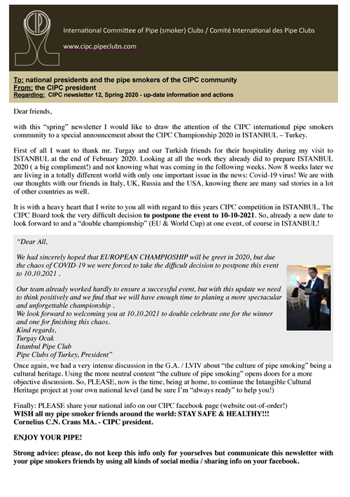 パイプ愛好家の皆様へのご連絡 国際パイプクラブ委員会(CIPC)からの通知をお伝えします。 CIPCは、今年2020年10月11日(日)にトルコのイスタンブールで開催予定のパイプ喫煙の欧州選手権大会(ヨーロピアンチャンピオンシップ)を武漢肺炎コロナウイルス禍のため、翌年の2021年10月10日(日)に1年延期することを決定致しました。 開催地は同じイスタンブールです。 主催者のトルコ・パイプクラブ連盟会長のTurgay Ocak氏は「今回の武漢ウイルス禍を前向きに考えたい。イスタンブール大会を、パイプ愛好家の皆様が忘れ得ぬ盛大な大会にするための十分な時間の余裕ができたと考えたい」とのことです。 CIPCのコーネリアス・クラン会長及び主催者のトルコ・パイプクラブ連盟のTurgay Ocak会長による正式発表をここに添付します。 |